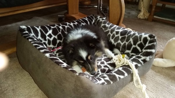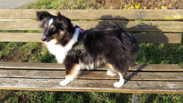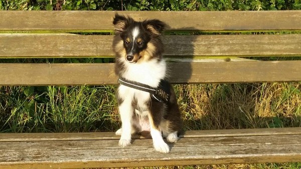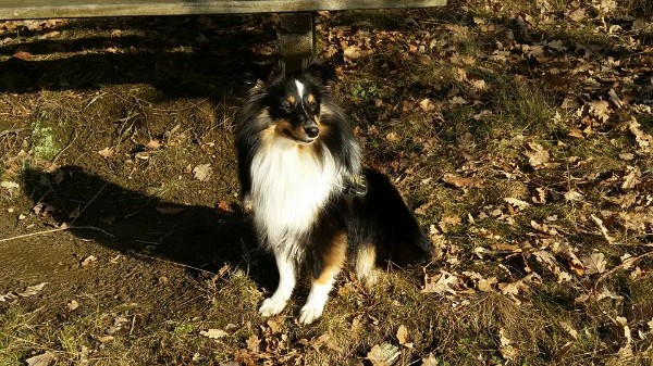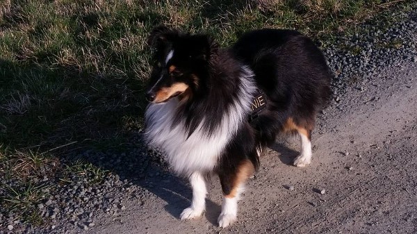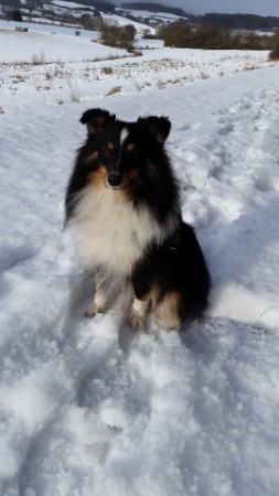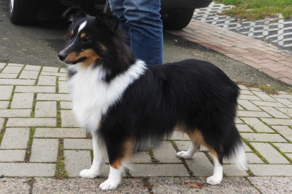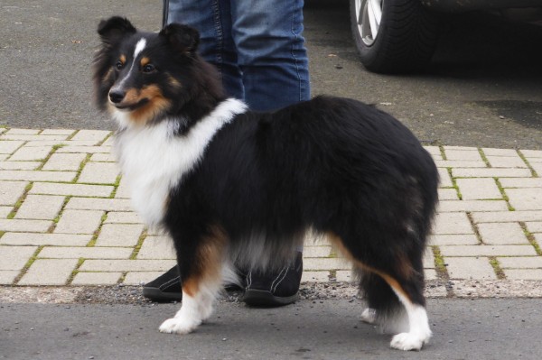 "Feminine tricolour Hündin, gut geschnittener Kopf, ausgeprägter Stop, sehr gute Hals-Rückenlinie, sehr gut entwickelte Brust, etwas steile Schulter, hinten korrekt gewinkelt, in der Bewegung hinten recht eng, freundliches Wesen, sehr gute Präsentation."