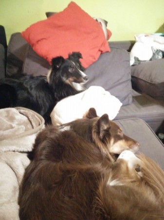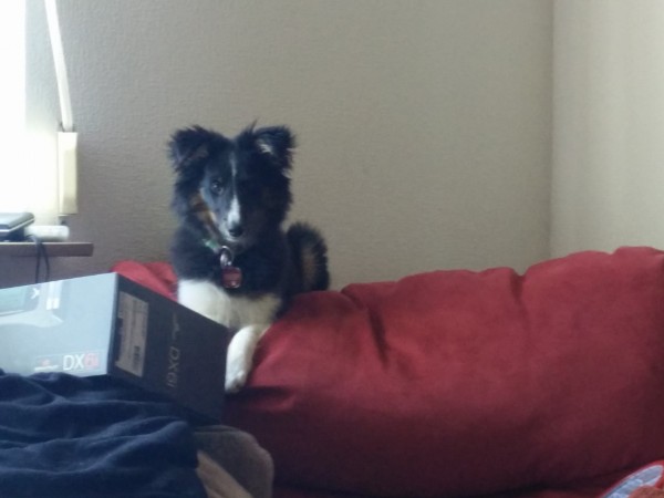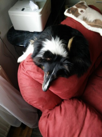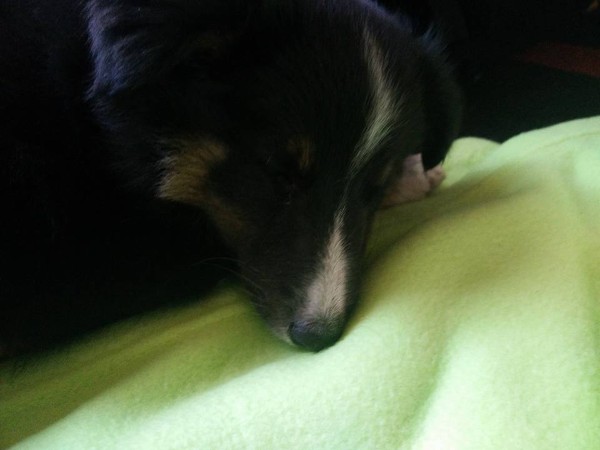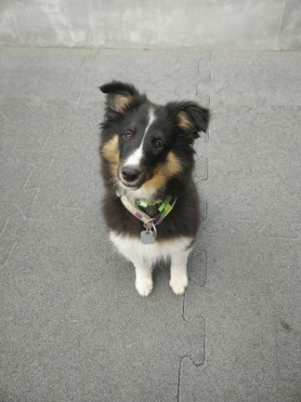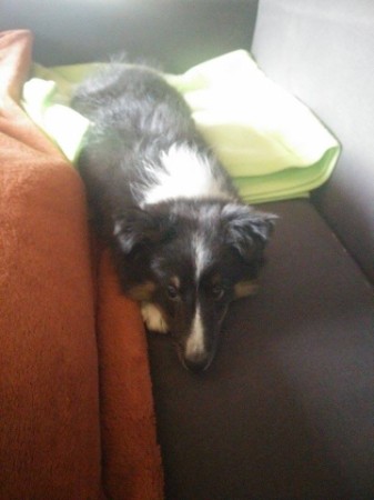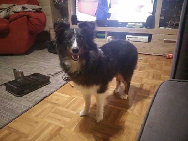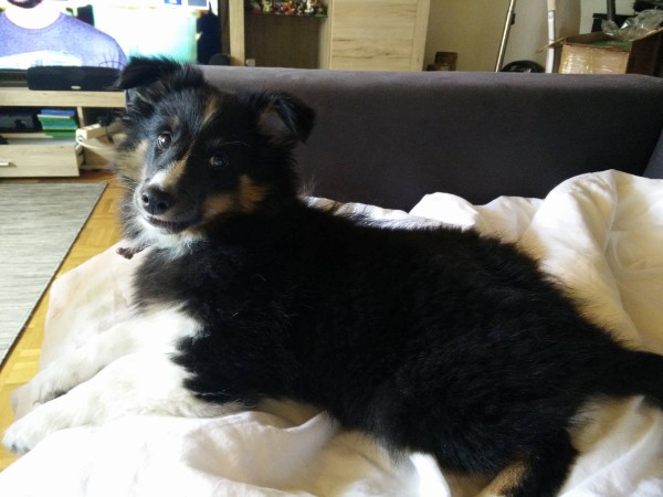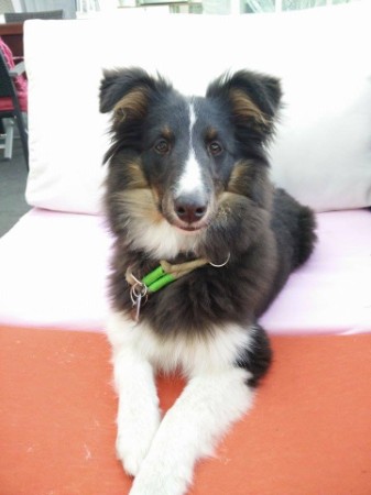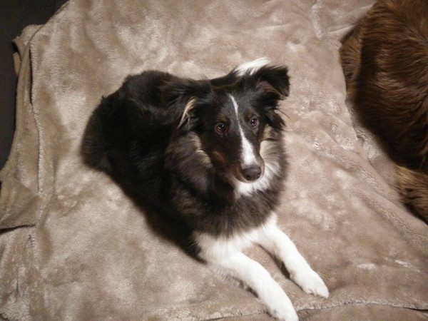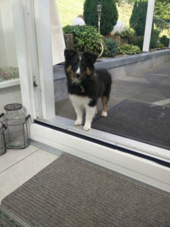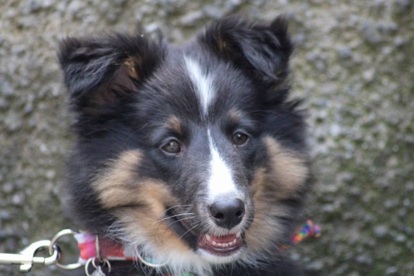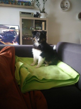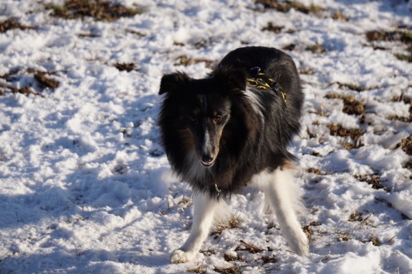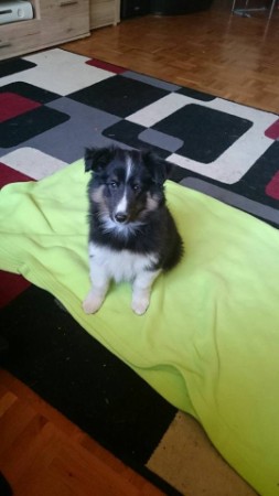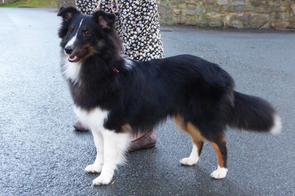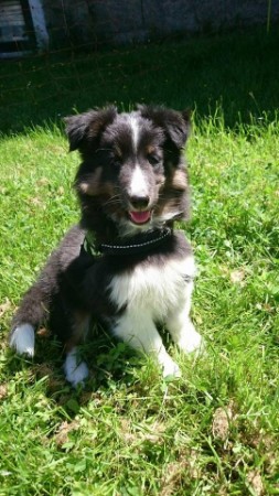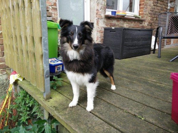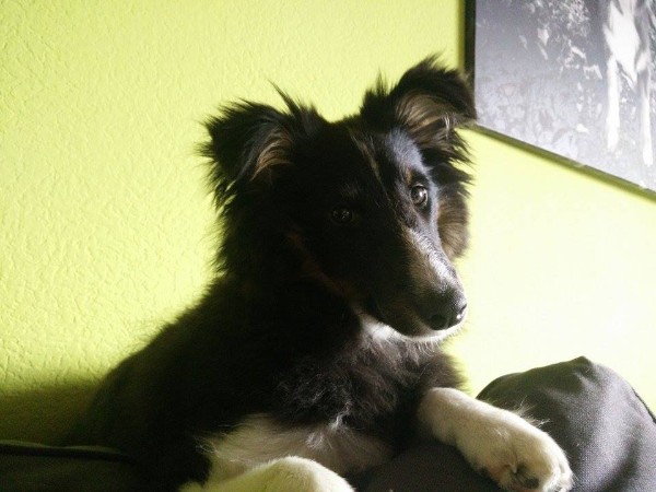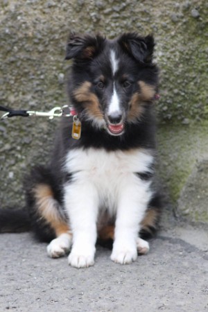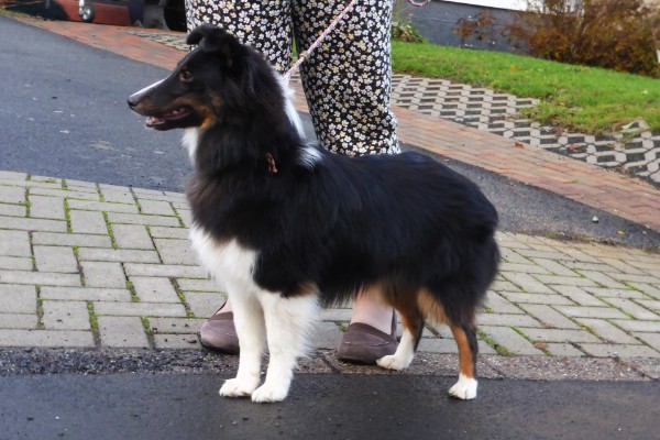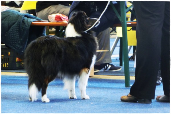 "Großrahmige tricolour Hündin mit Übergröße, ansprechendem Kopf und Ausdruck, etwas breit angesetzte Kippohren, sehr gute Halslänge, etwas lang im Rücken, vorne ausreichend, hinten korrekt gewinkelt, bewegt sich flott aber vorne steppend, sehr gute Haaranlage, freundlich und aufmerksam."