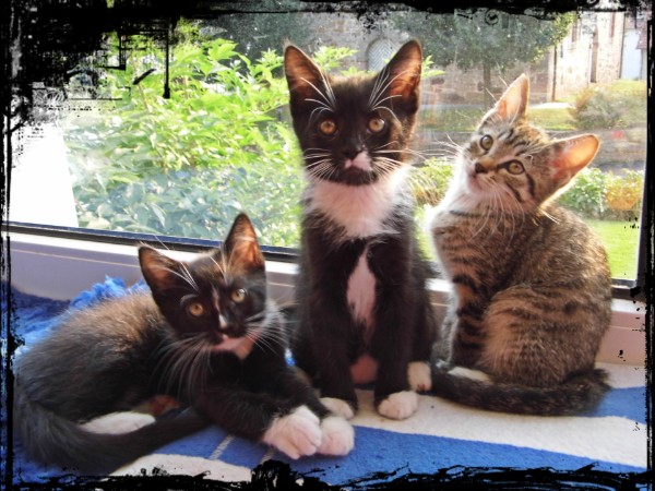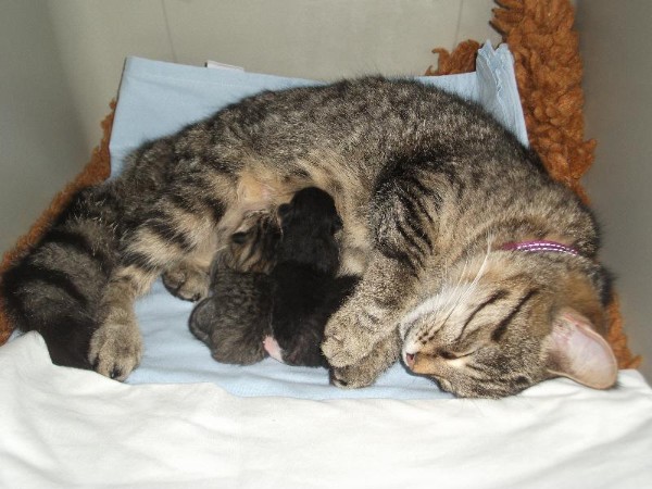 Lilly am 22. Juni 2013, dem Tag der Geburt, mit ihren drei Kitten.