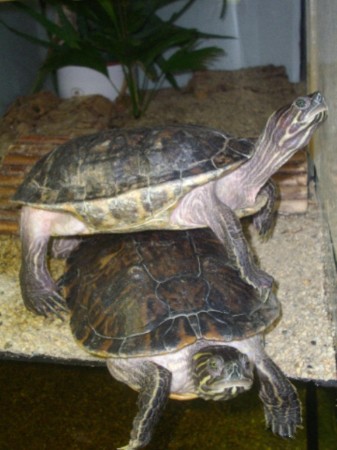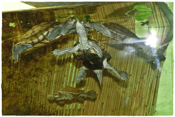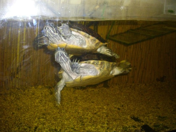 Hier wohnten in einer großem Anlage mit 2 Meter Aquarium und einem Meter Sandkasten die beiden weiblichen Hyroglyphenschmuckschildkröten Lucy und Chila sowie ihr kleiner Freund das Mississippihöckerschildkrötenmännchen Urmel, geboren im Jahr 2000.
