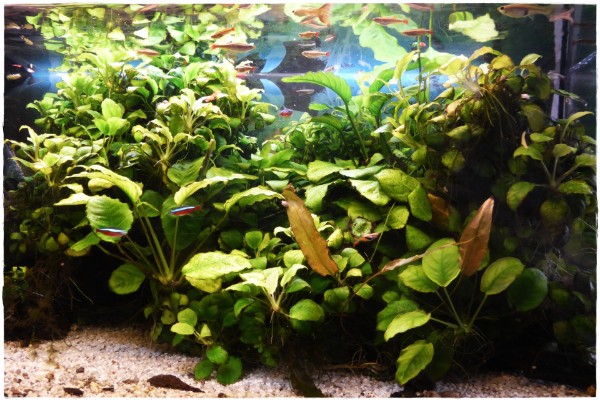 Hier wohnen einige Guppies, Neonsalmler, Kardinalfische, Schmerlen, Welse, Wasserschnecken und Zwerggarnelen friedlich miteinander im 80 cm-Becken.