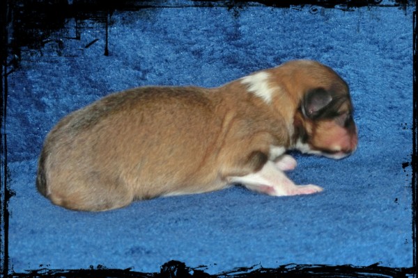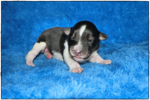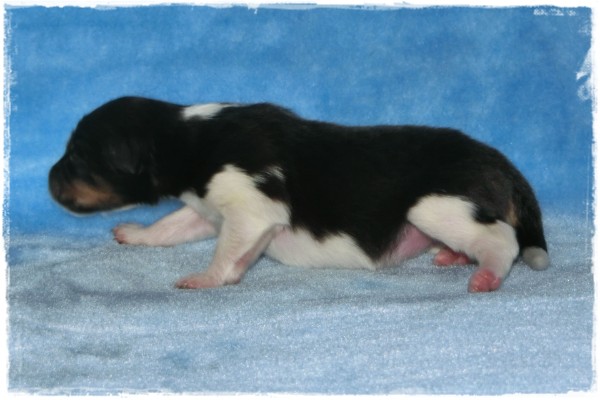 Sie ist ebenfalls tricolour, hat vorne weiße Stiefel und hinten weiße Schuhe, einen kleinen weißen Fleck an der Rute und zwei winzige weiße Strähnen im Nacken, auch Bauch und Brust sind weiß.