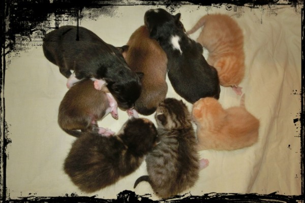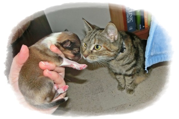 An ihrem vierten Tag lernten sie alle unsere Katzenbabies kennen, den bei uns sind Hunde und Katzen Freunde!