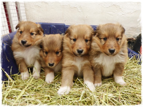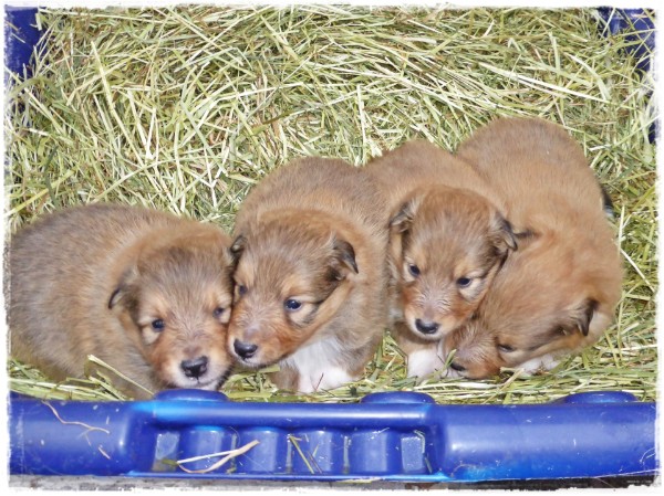 Golden Gina, Golden Gigolo, Golden Galeno und Golden Gracy schauen etwas vorwurfsvoll aus dem Heu hervor.