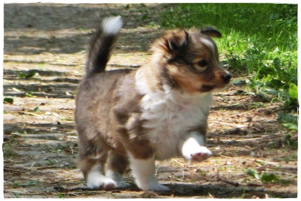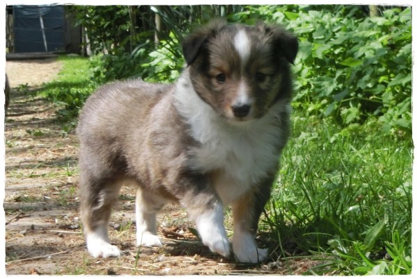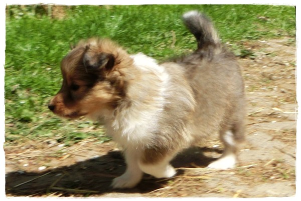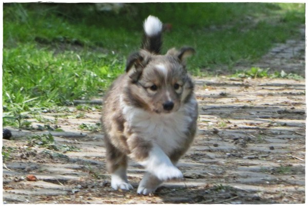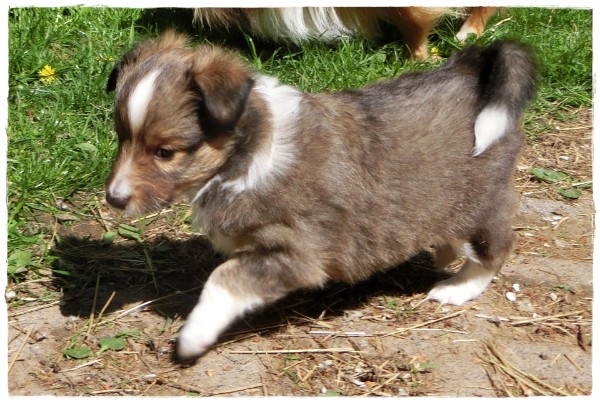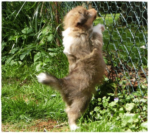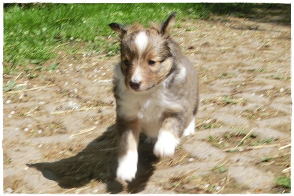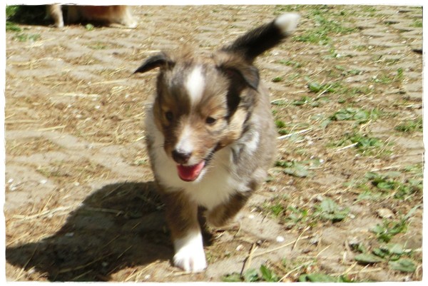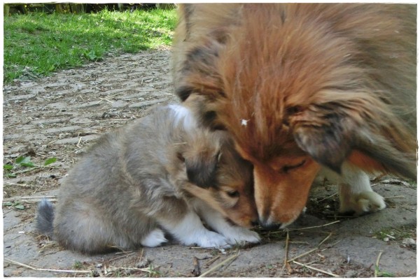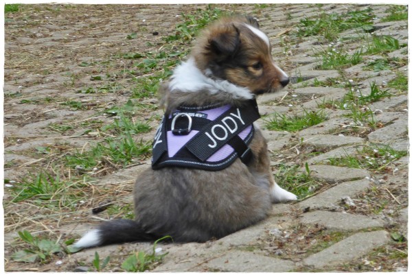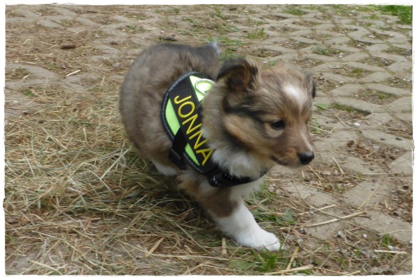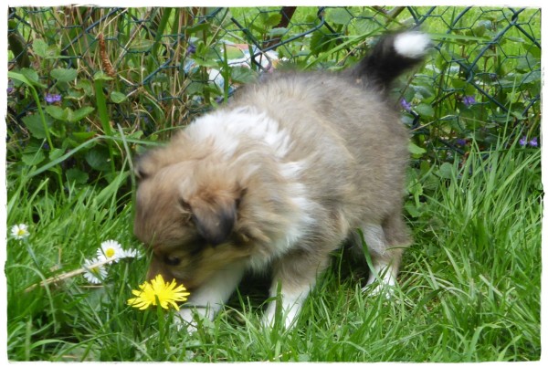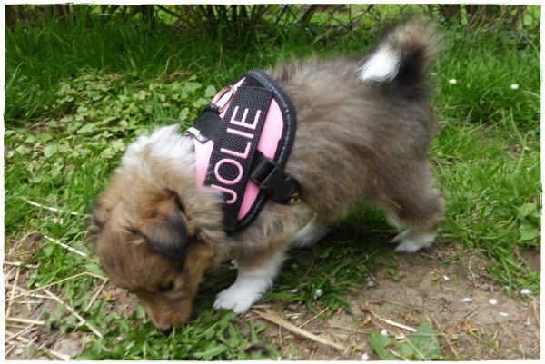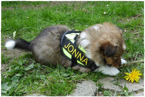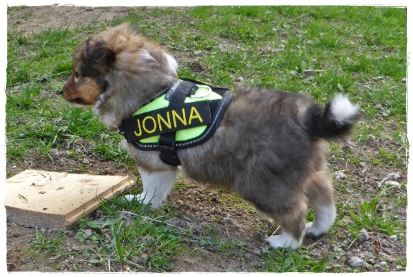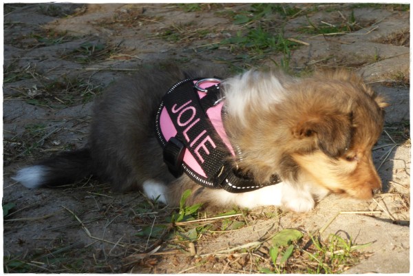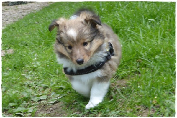 Hier sind sie wieder mit dem Rudel im Garten, mit Geschirr.