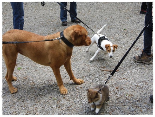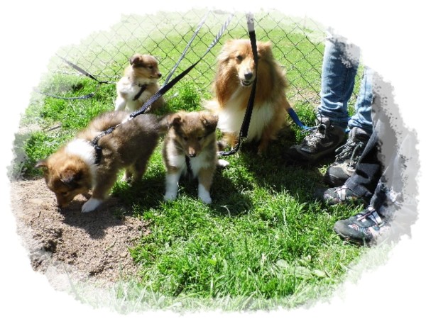 Alle Welpen sind mit Geschirr und Leine unterwegs: