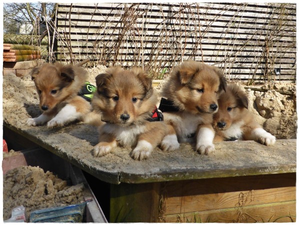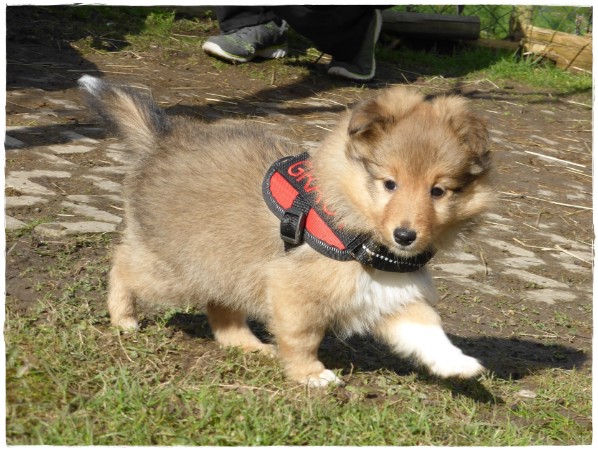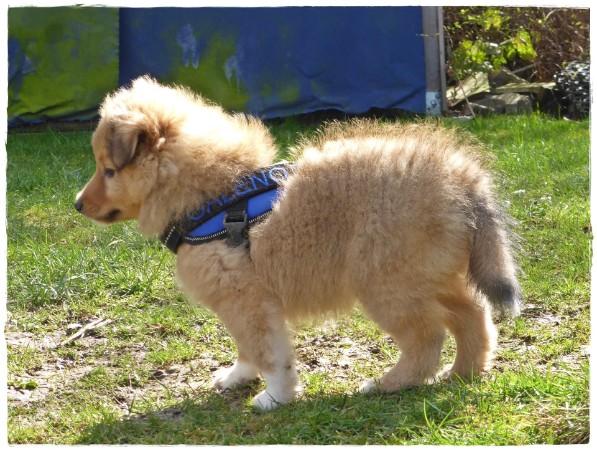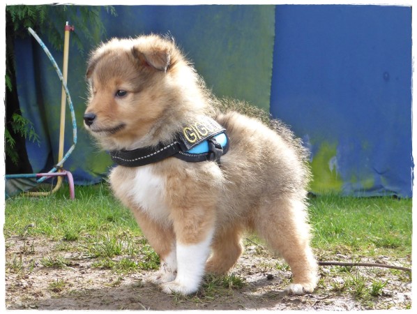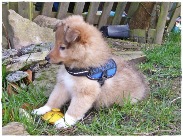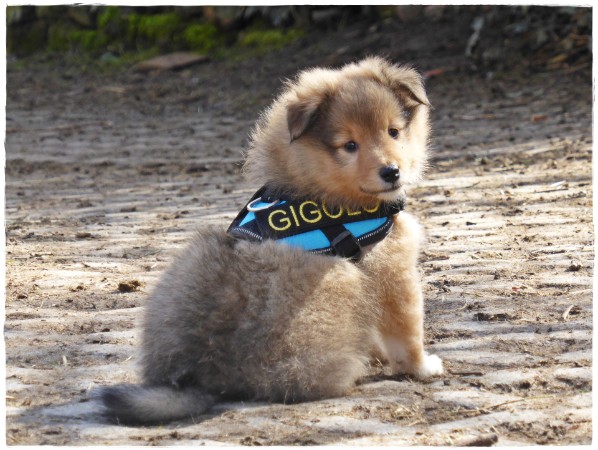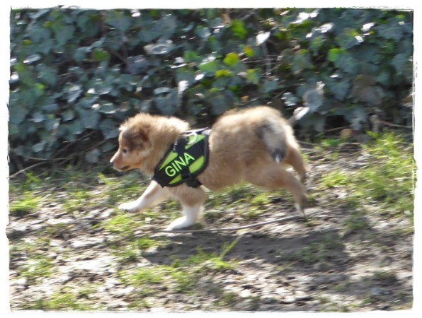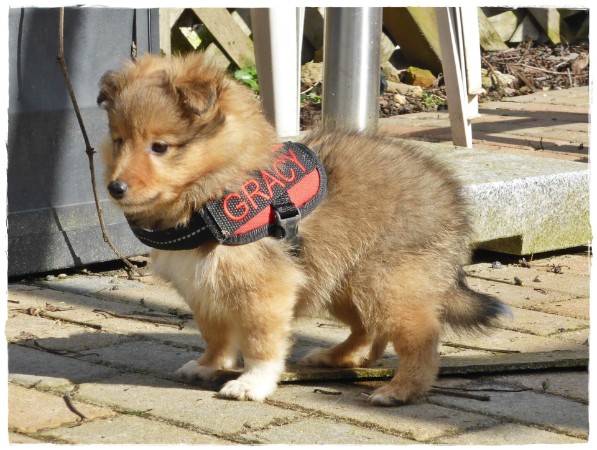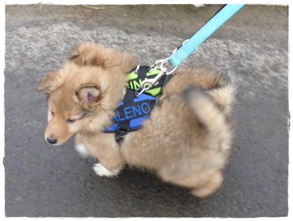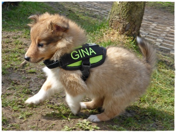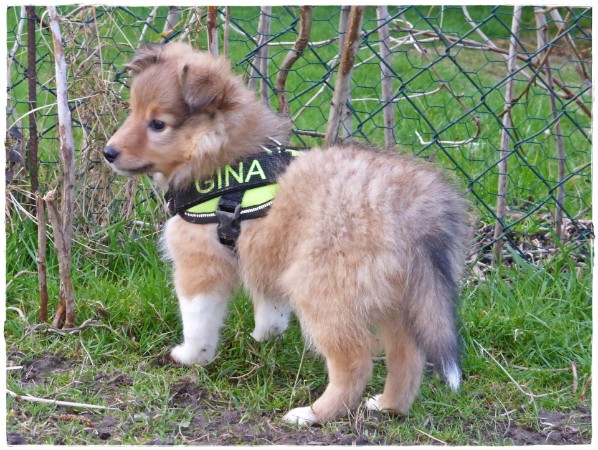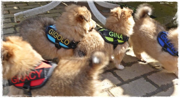 Golden Gracy, Golden Galeno, Golden Gina und Golden Gigolo das erste mal kurz an der Leine mit den neuen Geschirren.