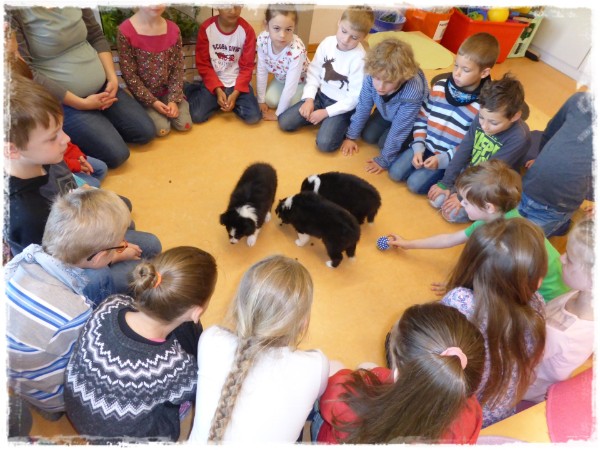 Es gab viele Streicheleinheiten und Leckerchen, ein sehr positive Erfahrung für die Welpen und die Kinder.