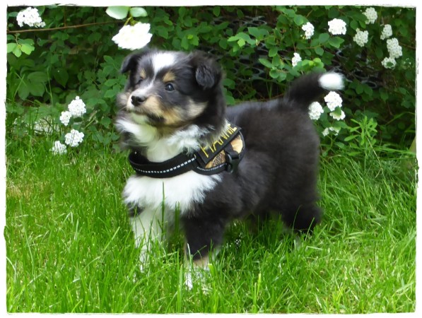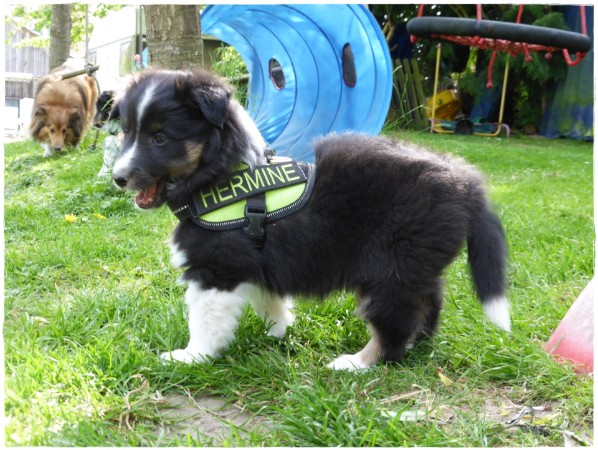 Am letzten Tag der 7. Woche laufen Hermine, Henry und Hannie das erste Mal an der Leine auf dem Feld.