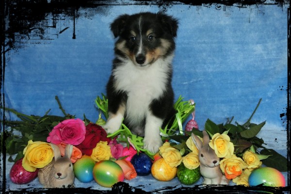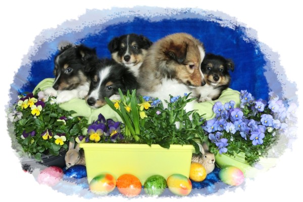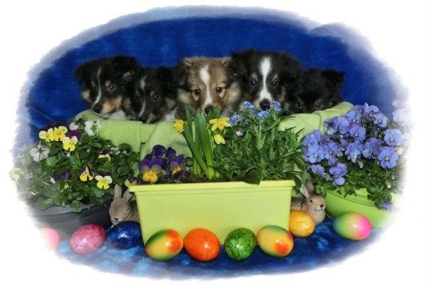 El Perro Foxi, Emir, Ernesto, Eros und Eragon im Osterkörbchen.
