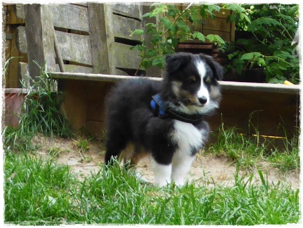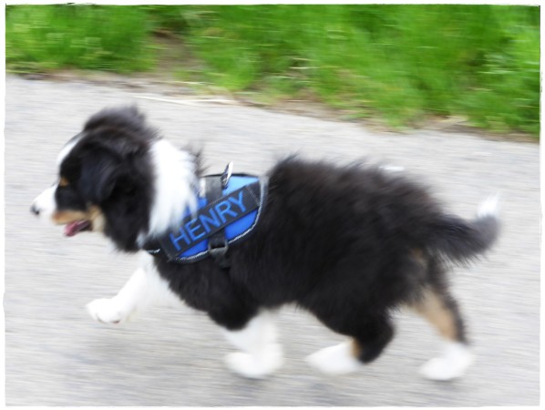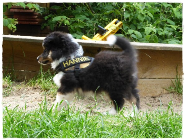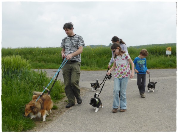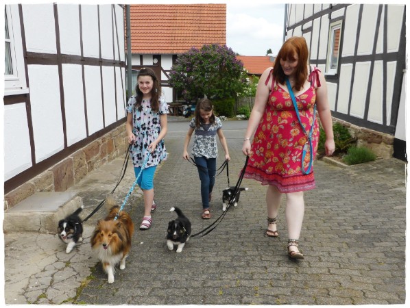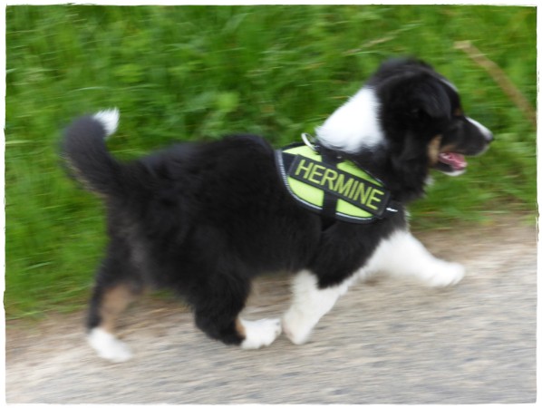 Fein laufen sie an der Leine, hier mit Hermines Frauchen an Tag 50 zu Beginn der 8. Woche.