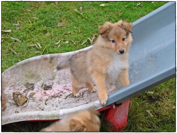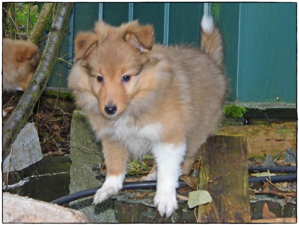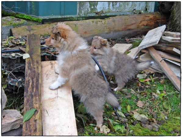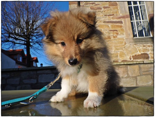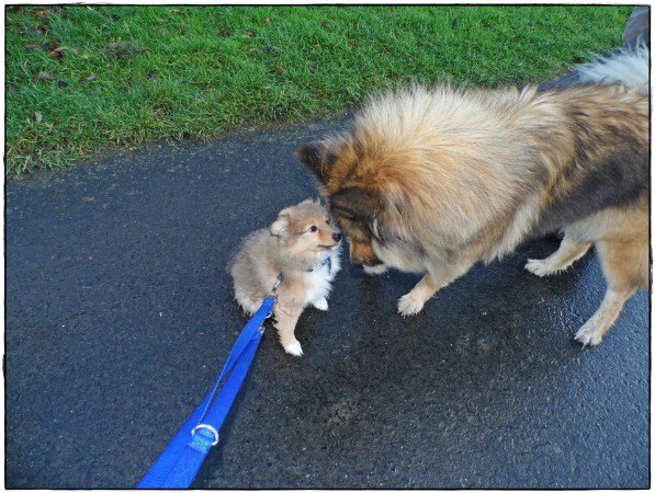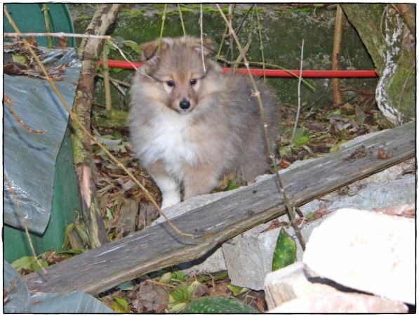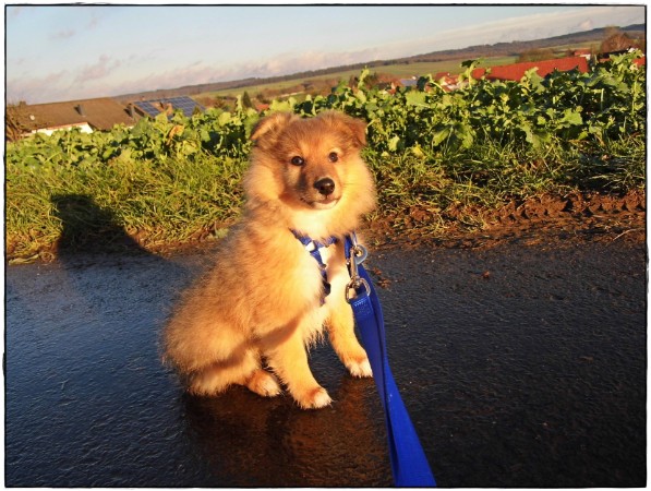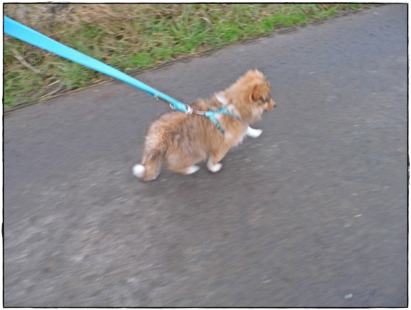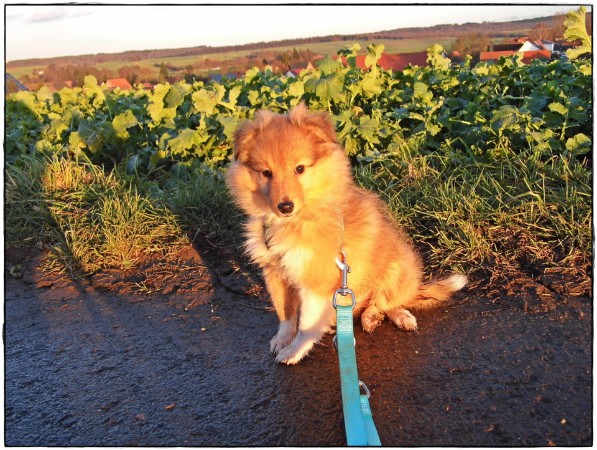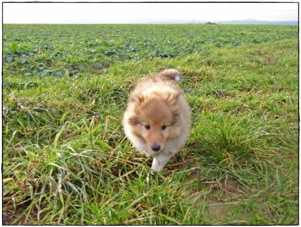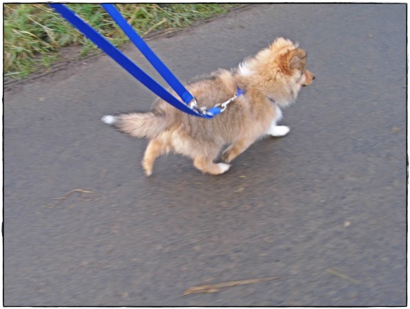 Nun wird auch mit jedem Welpen einzeln spazieren gegangen, erst an der Leine, dann frei. Hier sieht man, wie schön Bijou schon mit läuft!