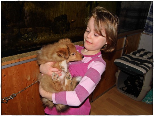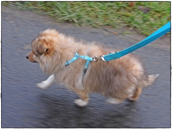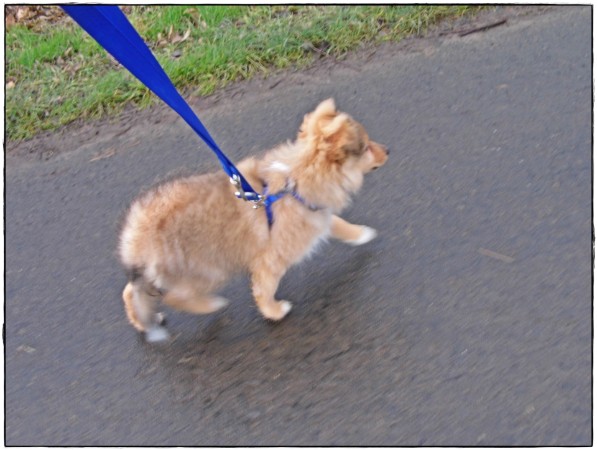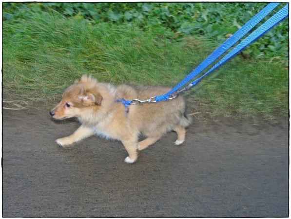 Hier trabt er an der Leine seines neuen kleinen Frauchens..